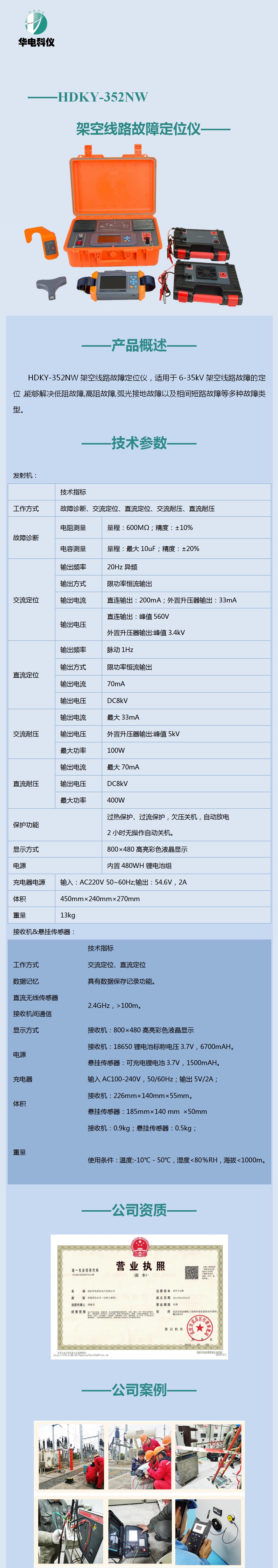 HDKY-352NW架空线路故障定位仪,适用于6-35kV架空线路故障的定位,能够解决低阻故障,高阻故障,弧光接地故障以及相间短路故障等多种故障类型。提供了一整套完整的架空线故障定位解决方案,集成故障诊断、交流定位、直流定位、直流耐压、交流耐压四种功能。创新的交流定位模式,对于低阻故障,在线路正下方检测特征信号, 无须登杆挂接传感器,具有操作简单,使用方便的特点。对于安装有智能开关(存在接地PT)线路发生的高阻故障,采用交流定位+升压器的方式,无需解除PT。发射机内置大容量锂电池,方便使用和携带。