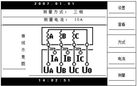 “方式”键: 设置测量方式,包括“单相”、“两相”和“三相”。并且在“接线示意图”的区域会显示相应的接线图,可作为实际接线时的参考。