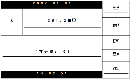测量完毕后,按 “退出” 键结束测量,此时,直阻仪开始自动放电,显示器相应的做出放电指示,以及蜂鸣器鸣叫。放电完毕,将回到初始界面,即可开始拆除测量接线。