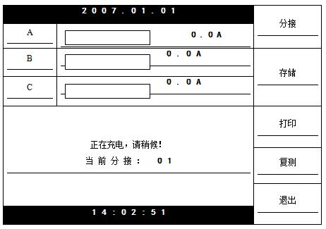 选择好测量电流,接好三相接线,在初始界面状态下按“测量”键后,直阻仪进入测量状态,开始给绕组供电。并进入如下界面: