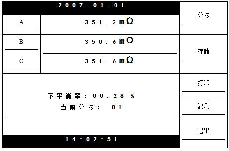 此时,直阻仪开始显示各相的电阻值,随着各相电阻值逐步趋于稳定,不平衡率将逐步减小。在此状态下,可以按“分接”键调整和设置当前分接值或绕组名,以便对测量结果进行标注。按下“分接”键后,右侧的多功能键变成“▲”“▼”“