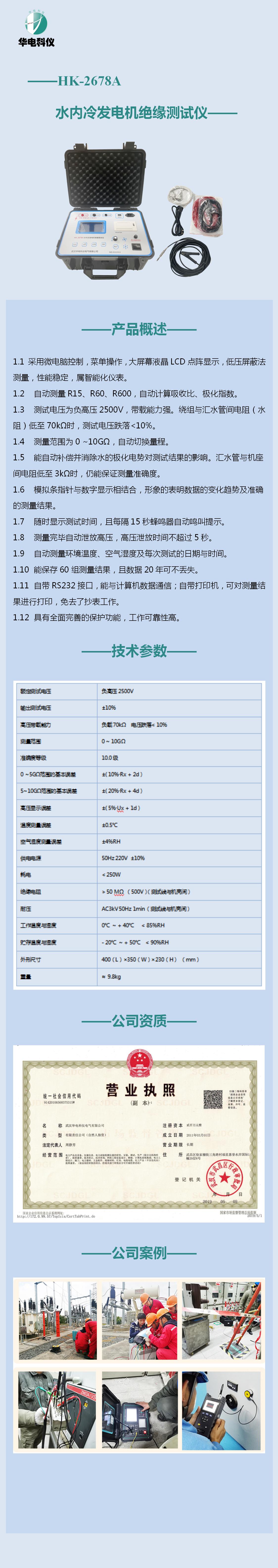 HK-2678A 水内冷发电机绝缘特性测试仪采用微电脑控制,菜单操作,大屏幕液晶LCD点阵显示,低压屏蔽法测量,性能稳定,属智能化仪表。