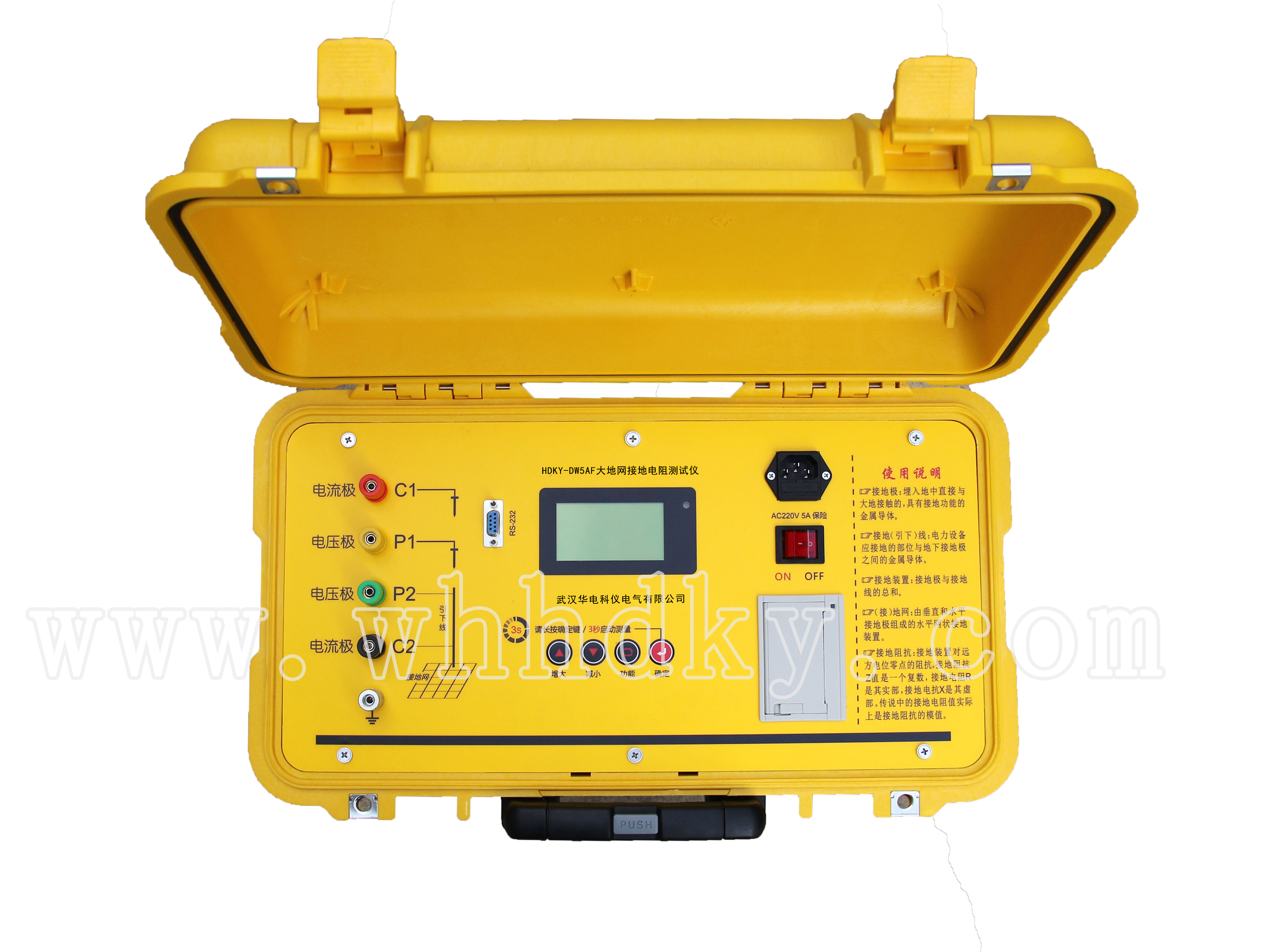 设备名称:大地网接地电阻测试仪 型 号:HDKY-DW5AF 数 量:1台套 生产厂家:武汉华电科仪电气有限公司
